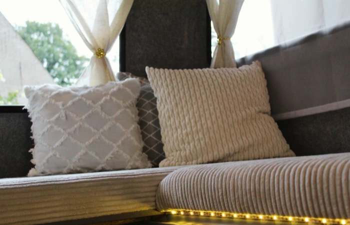 Eine Sitzbank mit edlem Cordstoffüberzug sorgt für eine gemütliche, stilvolle Atmosphäre und macht den Caravan zu einem echten Wohlfühlraum. Warmes Licht und ein harmonisches Gesamtkonzept schaffen dabei den perfekten Rahmen für eure Gäste.